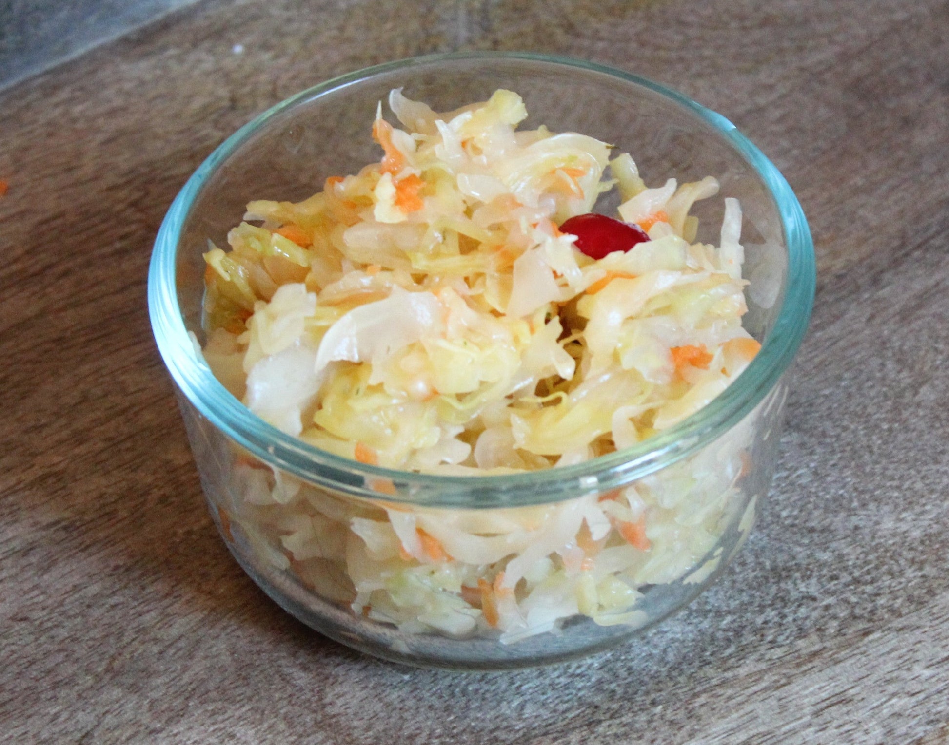 This is the sauerkraut Aksana grew up with and has prepared for friends and family her whole life. It's a mix of fresh white cabbage, carrots, and cranberries, and is delicious right out of the container or as a salad with a little oil and chopped fresh onion.
